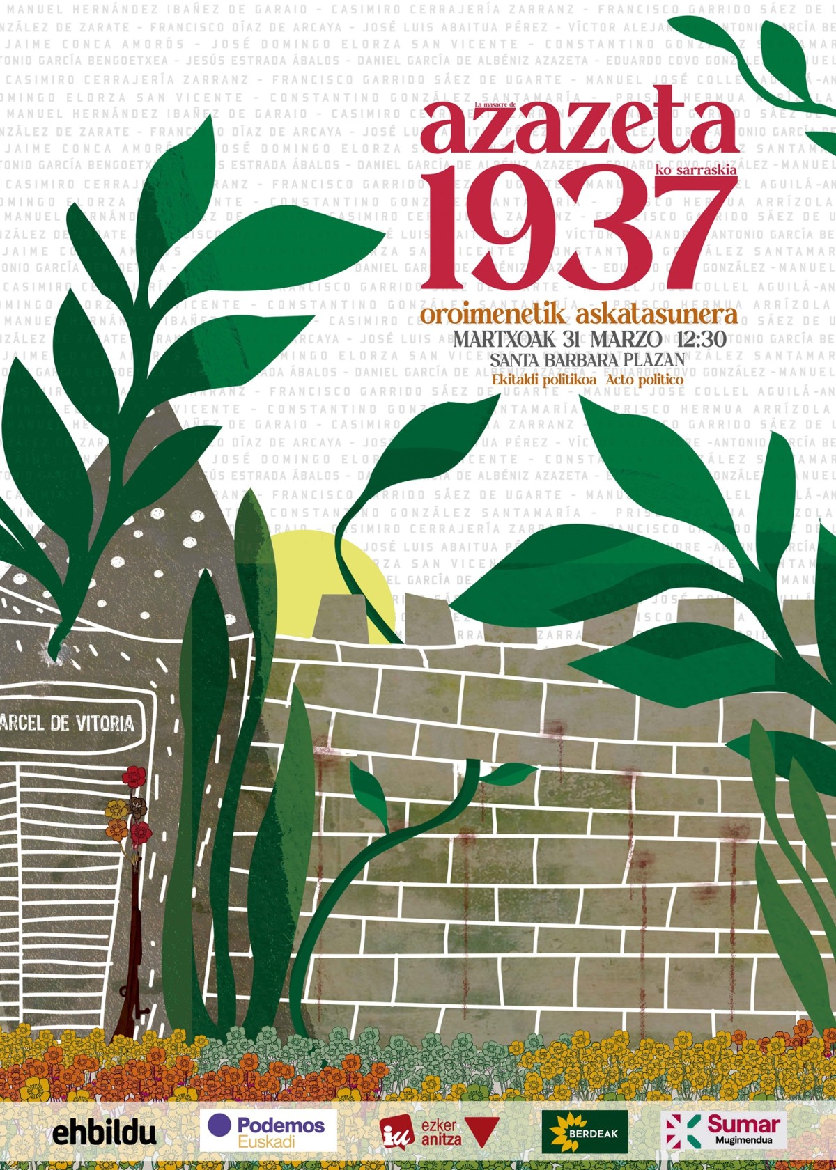 EH Bilduk, Podemos Euskadik, Ezker Anitza-IUk, Berdeek eta Sumar Mugimenduak Arabako indar aurrerakoi, subiranista, errepublikar eta ezkertiarren lankidetza aldarrikatuko dute, faxismoaren aurrean fronte zabalak eta gutxieneko programak bultzatzeko. Azazetako sarraskiaren 89. urteurrenean egingo dute martxoaren 31an egongo den ekitaldian. 12:30ean izango da Gasteizko Santa Barbara plazan. Bertatik duela 89 urte, martxoaren 31ko goizaldean, Araba aurrerakoi, abertzale, errepublikar eta ezkertiarreko 16 pertsona esanguratsu atera zituzten Bakearen kartzelatik Azazetako portura eramateko. Bertan hil eta lurperatu zituzten.